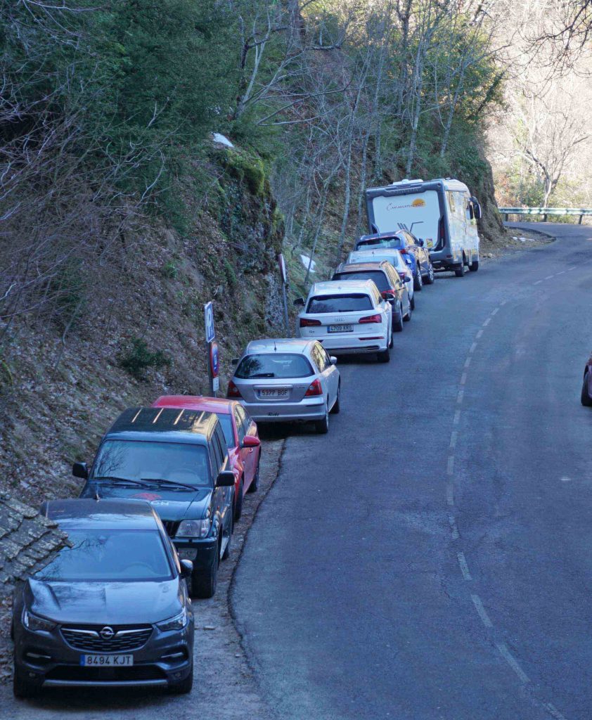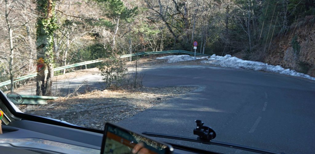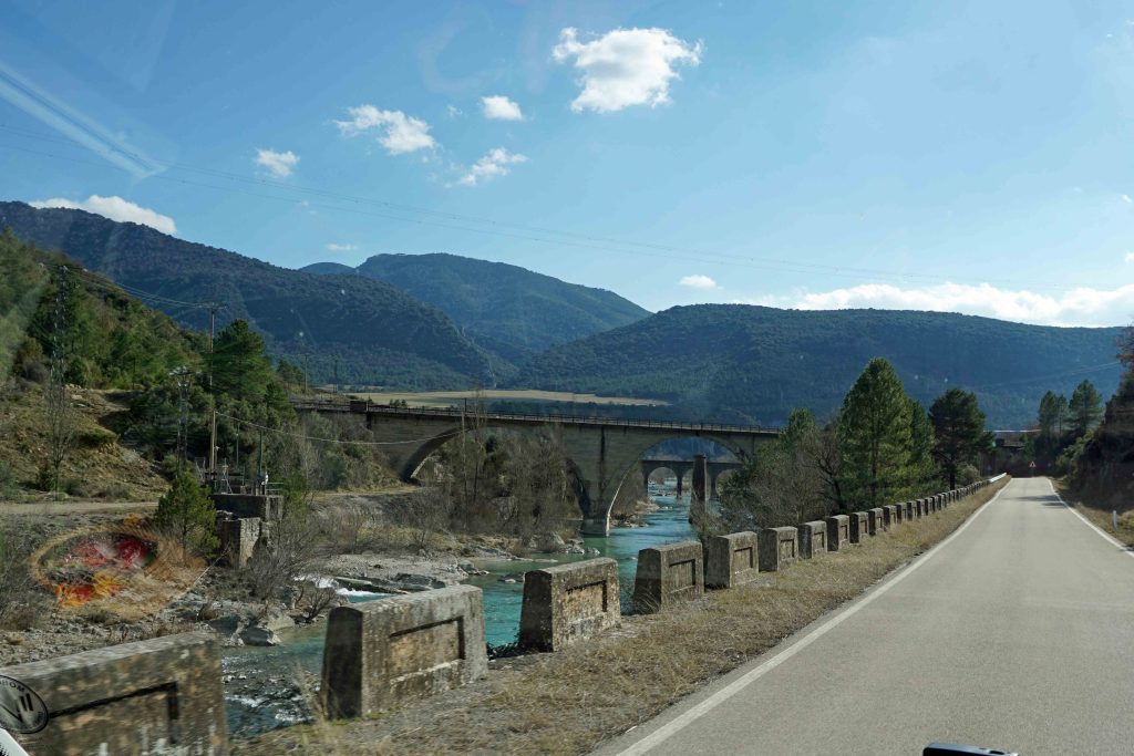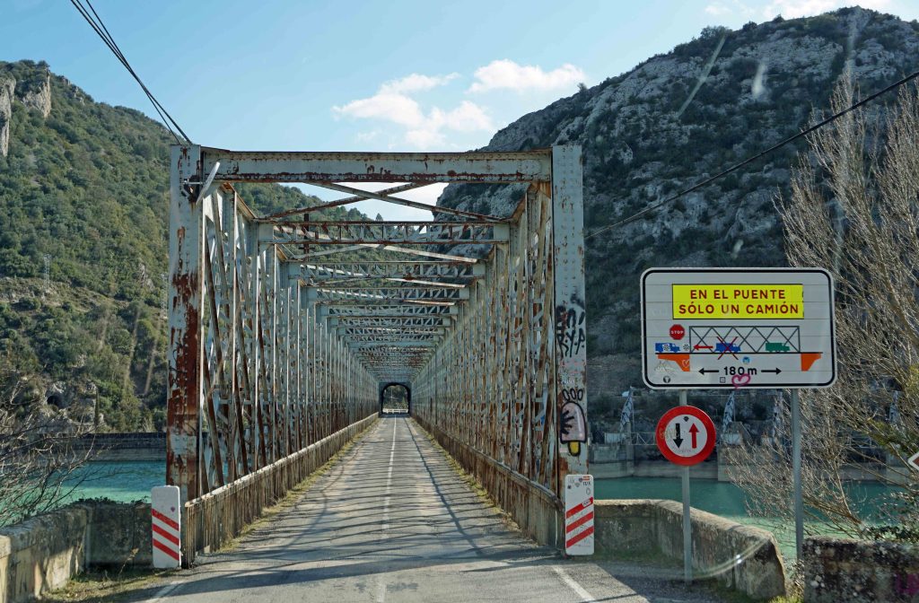We rijden nu eerst terug naar Jaca de voormalige hoofdstad van het koninkrijk Aragón om een mooie route op te pikken, op de kaart zo’n geel weggetje met een groen randje er langs. Nu dat groene randje maakt de route volledig waar maar een geel weggetje is het in het verleden misschien ooit geweest maar er is al heel lang geen onderhoud gepleegd, de randen zijn afgebrokkeld en we stuiteren over het wegdek. Een brug waar maar één vrachtauto per keer over mag rijden geeft ook veel vertrouwen. Voordeel is dan wel weer dat er weinig anderen rijden.