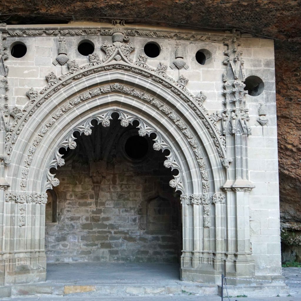 Op een richel gebouwd en half in de berg uitgehakt is dit een zeer bijzonder gebouw, de bovenverdieping (het Pantéon Real) van het oude klooster herbergt vijf eeuwen grafnissen van de vorsten en edelen van Aragón. De bouw beslaat verschillende tijden en stijlen en in de laatste periode van gebruik ook duidelijke vormen van overdaad en decadentie.