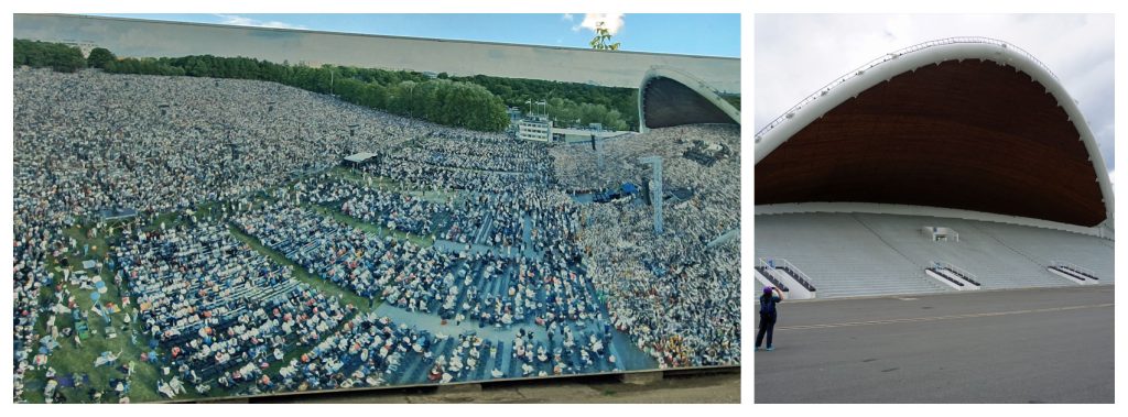Bij een groot openlucht songfestival terrein staan we stil. Songfestival is een enorme happening hier en dan niet het Eurovisie songfestival maar hun eigen Songfestival van de Baltische staten waar door vele koren gezongen wordt. Het eerste songfestival werd in 1869 in Estland gehouden en in 1873 in Letland en Litouwen sloot zich in 1924 aan. Hett werd door de Russen toegestaan om op te treden met volksliederen maar het werd steeds meer een uiting van protest en kwam bekend te staan als de zingende revolutie. Nu wordt elke 5 jaar een enorm groot festival georganiseerd, op deze plek kunnen 22.000 mensen op het podium staan zingen en dat zijn dan professionele koren. Ruim 150.000 bezoekers komen eropaf en de gids verheugde zich er al op want volgend jaar wordt het weer hier in Estland gehouden.