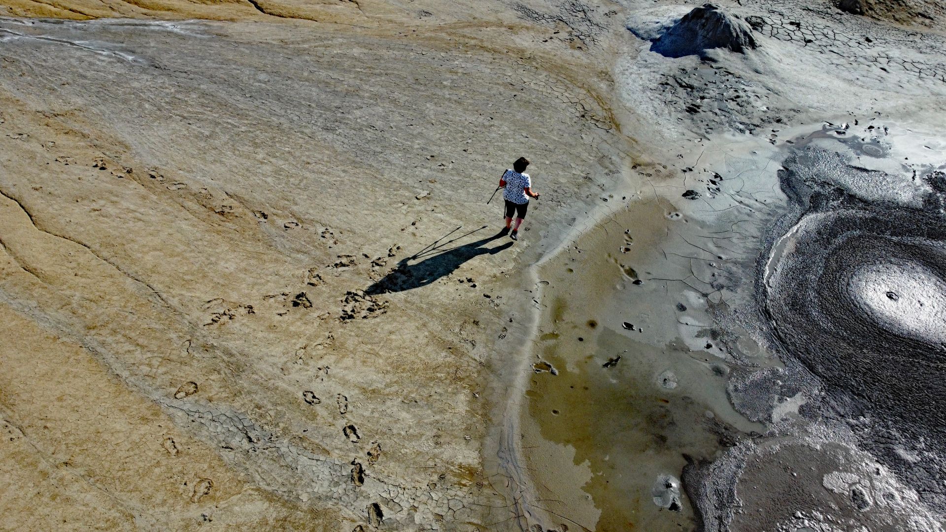 Het laatste traject van deze dag is weer aantrekkelijk, we rijden een mooi heuvelland in over zeer smalle wegen. Zien weer een mooi grenspaaltje die hier altijd in de vorm van een kruis zijn. Wij komen aan in het gebied van de moddervulkanen vandaar de naam camping Muddy Land. Een moddervulkaan bestaat uit modder en gas dat vanuit een ondergronds reservoir naar buiten stroomt. Het pad naar deze vulkanen begint op de camping, wij wandelen in de namiddag omhoog terwijl de laatste dagjesmensen dan net vertrekken dus wij dwalen alleen rond op dit maanlandschap. We genieten van de rust en het stille geborrel van de gasbellen. We slaan aan het fotograferen en filmen maar net als ik denk het geluid van de plopjes en het geborrel op te nemen komt Marcel met zijn zoemende drone even lekker kijken wat ik doe, lekker dan nu is mijn mooie opname verprutst. Maar wat een bijzondere plek.